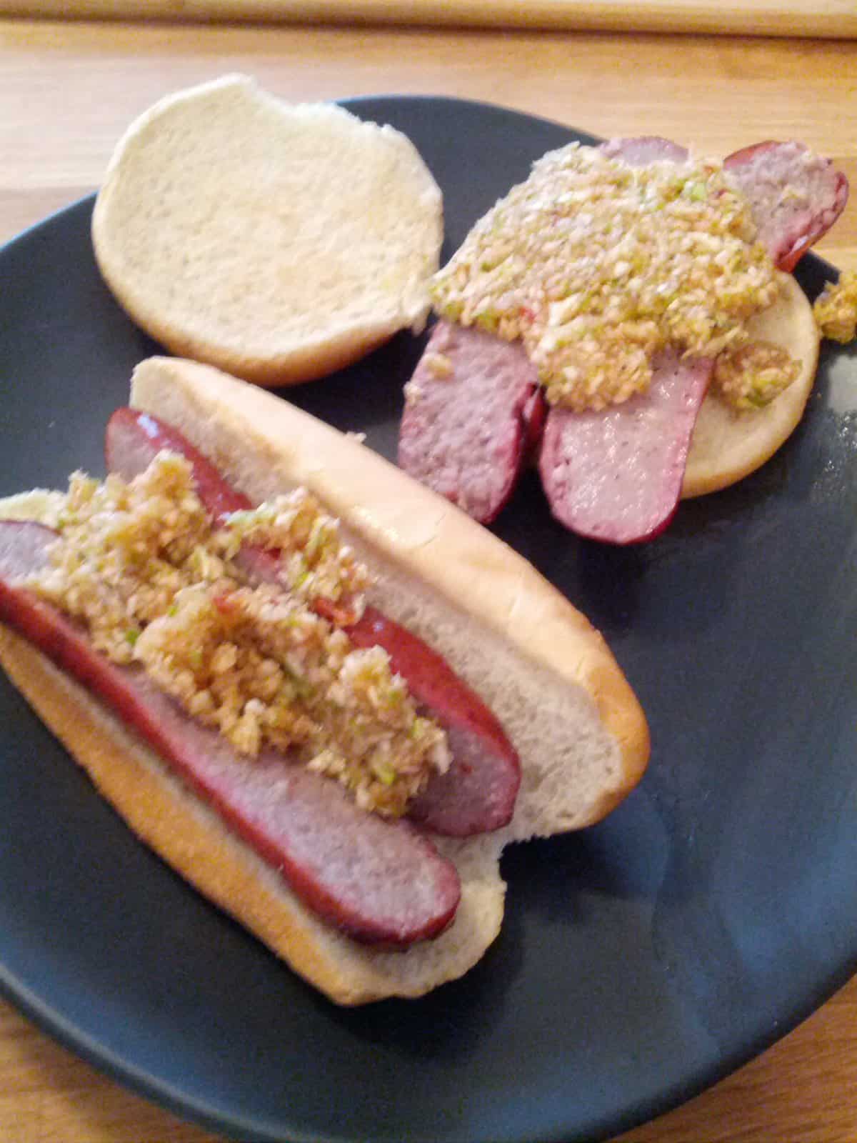 While no one is likely to confuse this for a more conventional NC BBQ sandwich you do get some elements of them. The meat is completely different but it does work very well with these flavors. The slaw has a little sweetness and the acid from the vinegar cuts through some of the richness of the brat.